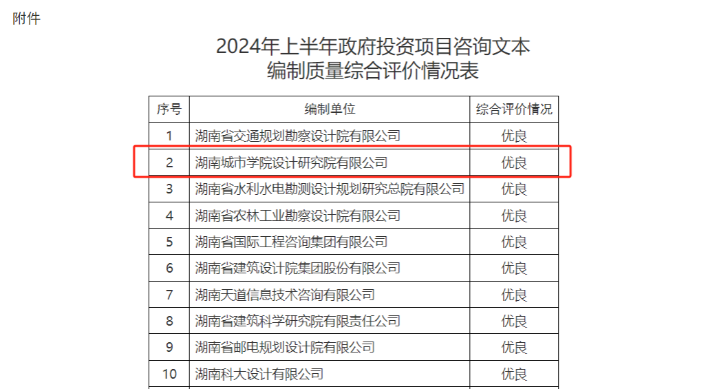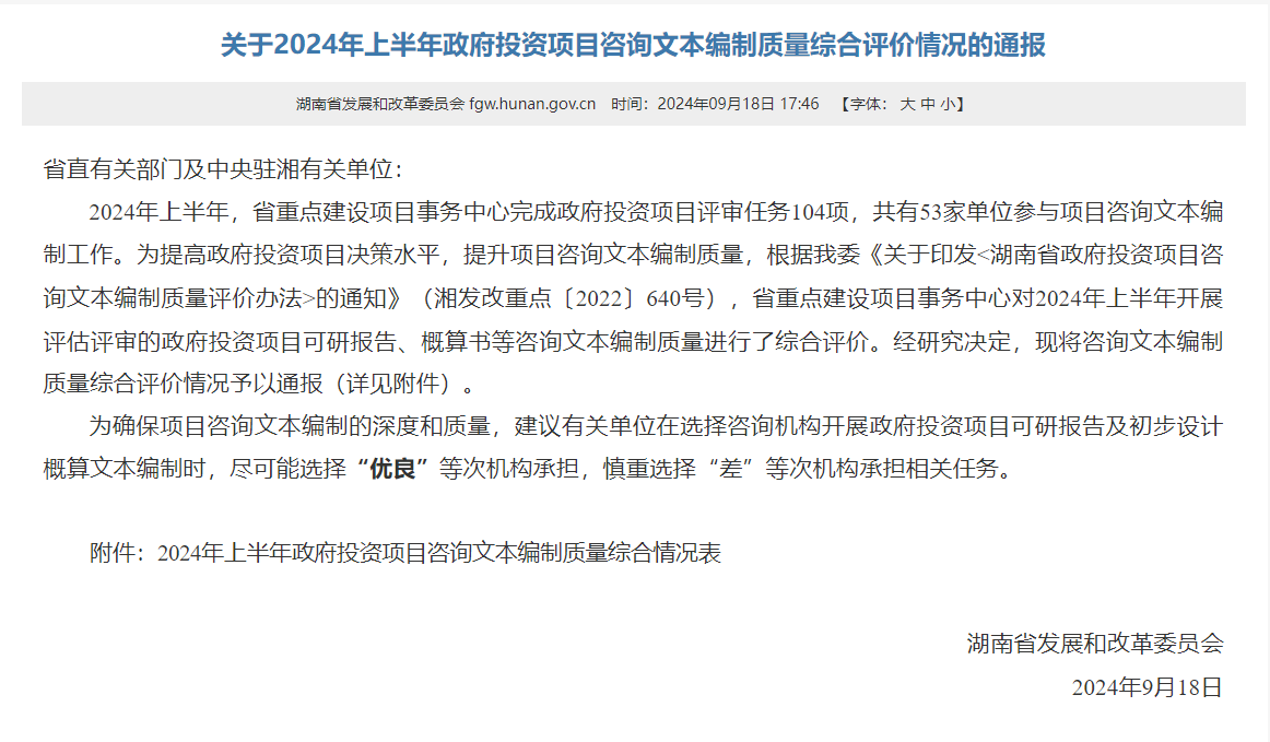 9月18日,湖南省发展和改革委员会发布《关于2024年上半年政府投资项目咨询文本编制质量综合评价情况的通报》,2024年上半年,省重点建设项目事务中心完成政府投资项目评审任务104项,共有53家单位参与项目咨询文本编制工作,省重点建设项目事务中心对2024年上半年开展评估评审的政府投资项目可研报告、概算书等咨询文本编制质量进行了综合评价。Beat365中文官方网站设计研究院有限公司获评优良(排名第二)。