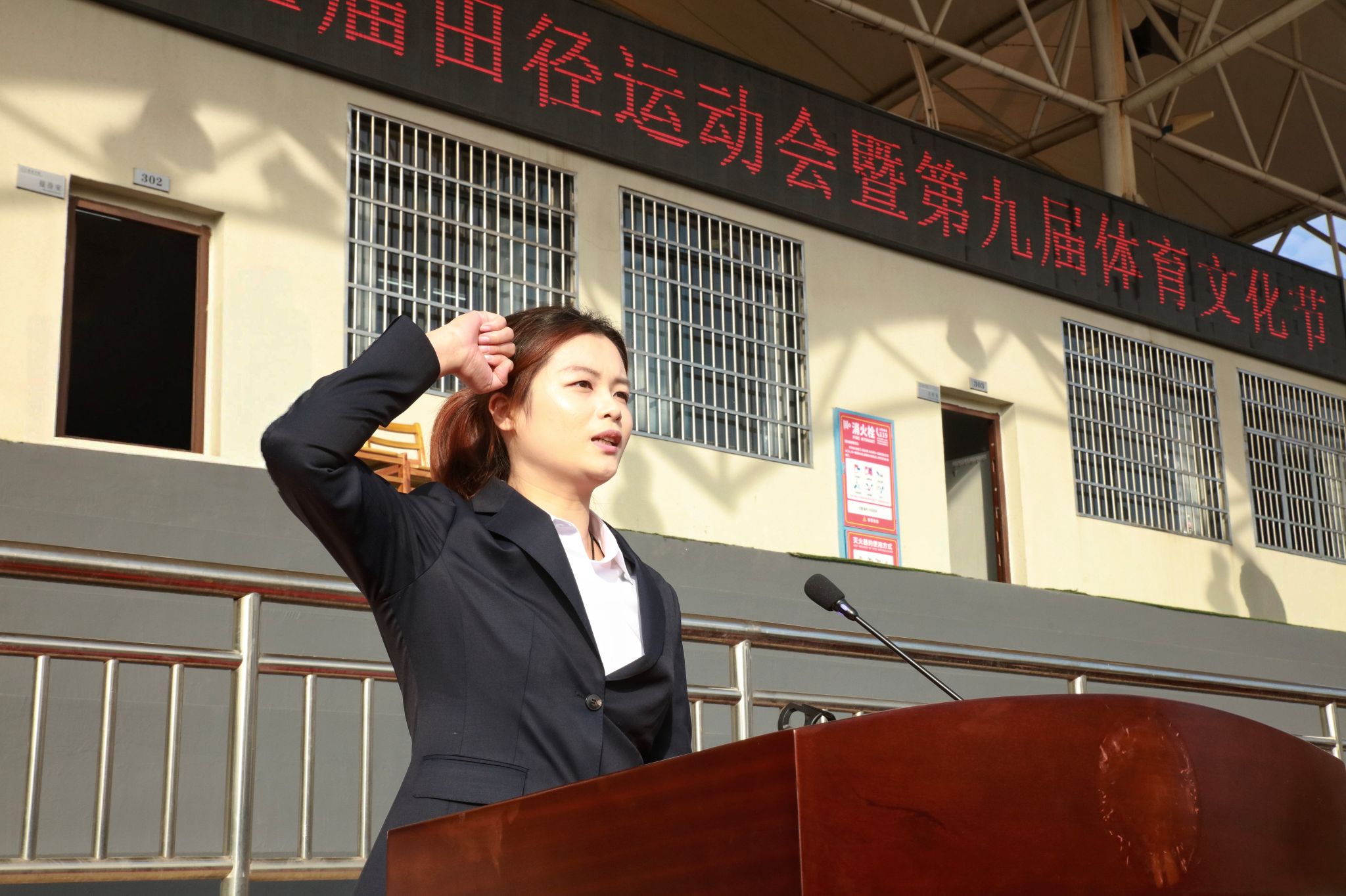 运动员代表李红和裁判员代表陈凤杰面向全体师生庄严宣誓,承诺以积极饱满的热情参加本届运动会,奋力进取,赛出水平,赛出风格;严格遵守竞赛规则和裁判员纪律,保证公平公正。