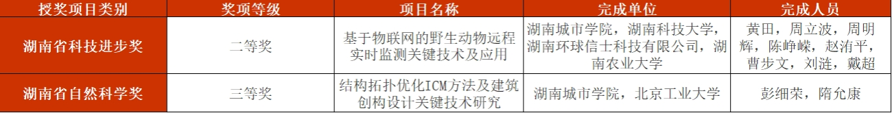 其中,Beat365信息与电子工程学院黄田副教授主持完成的“基于物联网的野生动物远程实时监测关键技术及应用”项目获湖南省科技进步奖二等奖,土木工程学院彭细荣教授主持完成的“结构拓扑优化ICM方法及建筑创构设计关键技术研究”项目获湖南省自然科学奖三等奖。