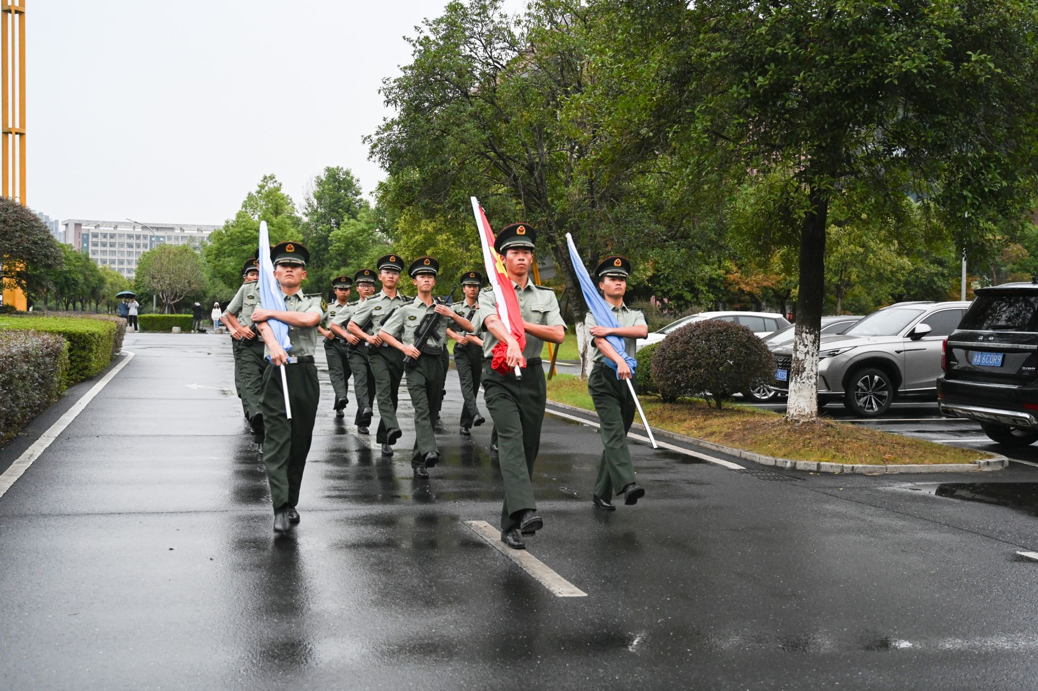 清晨7:00,升旗仪式正式开始。校国旗班的同学迈着铿锵有力的步伐,喊着嘹亮的口号,护送国旗入场。伴随着雄壮的《义勇军进行曲》,鲜艳的五星红旗冉冉升起。全体师生庄严肃立,向国旗行注目礼,齐唱国歌,向伟大祖国致以崇高敬礼和美好祝福。
