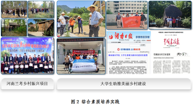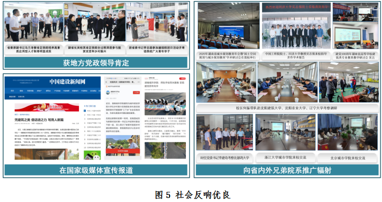 4.守正创新,面向中小城镇培育综合素质。围绕服务中小城镇、开展创新创业教育,通过大学生创新创业课题、互联网+、社会实践、“暑假三下乡”、乡村振兴设计下乡等,培养服务中小城镇“全科医生式”规划建筑人才;采用五育并举,培养毕业生全面发展综合素养。学校设计院获湖南省普通高校校企合作创新创业教育基地和中心。