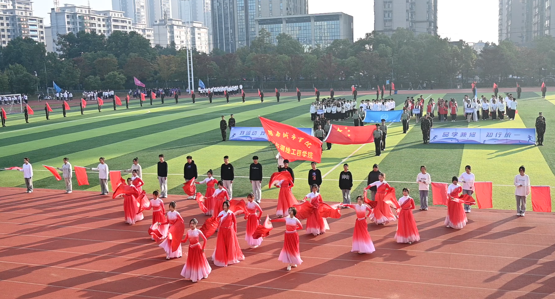 在入场式中,各二级学院运动员们还为现场观众献上了一场精彩纷呈的视觉盛宴。人文学院带来的舞蹈《华夏》惊艳了全场,当古老的编钟与现代音乐交织在一起,当传统的服饰与现代的舞步相互碰撞,如同历史的长河,流淌着岁月的痕迹。理学院带来的敦煌舞,舞者们好似从古老敦煌穿越而来,衣袂飘飘,彩带飞扬。她们用灵动身姿演绎着千年传奇,举手投足间尽显敦煌神韵。青春的活力与古老的文化完美交融,仿佛时光交错……