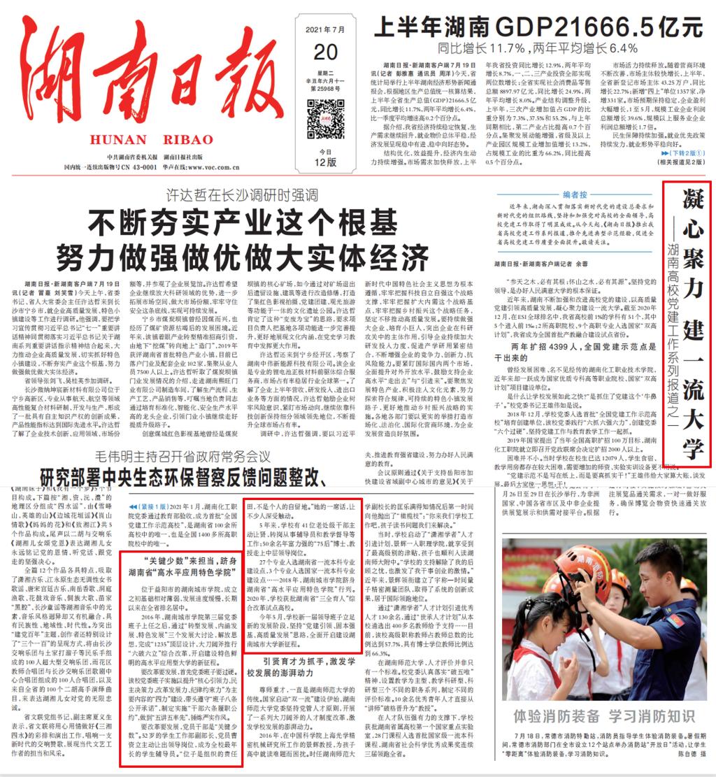 《湖南日报》7月20日头版报道Beat365以高质量党建引领高质量发展,凝心聚力建设一流大学。