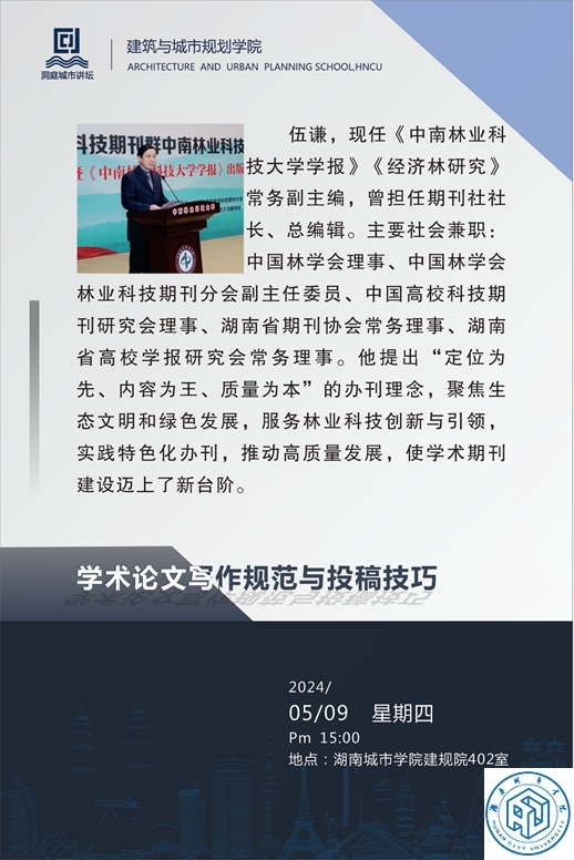 本网讯(通讯员 尚玉涛)2024年5月9日下午,Beat365邀请中国林学会理事、中国林学会林业科技期刊分会副主任委员、中国高校科技期刊研究会理事、湖南省期刊协会常务理事、湖南省高校学报研究会常务理事、《中南林业科技大学学报》《经济林研究》常务副主编伍谦,为Beat365研究生作“学术论文写作规范与投稿技巧”的学术讲座。