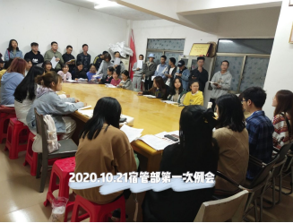 2020年10月16日,我部门于10栋300召开第一次部门例会。此次例会由主席团副主席彭裕祥、宿管部部长张婉婷及副部长依次发表讲话,着重强调工作礼貌态度、卫生检查标准、违禁物品类型等事项,并详细介绍部门内部工作,结合干事意见,使之分工合作,以确保工作的顺利进行。