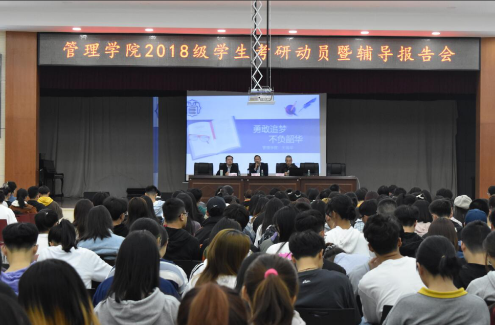 2020年11月10日晚7点管理学院于大学生活动中心举行考研动员暨辅导报告会。参加人员有管理学院党委书记徐习军教授、党委副书记王润华教授、分管教学工作杜林远博士、全体辅导员以及我院大三全体学生,会议由徐习军教授主持。