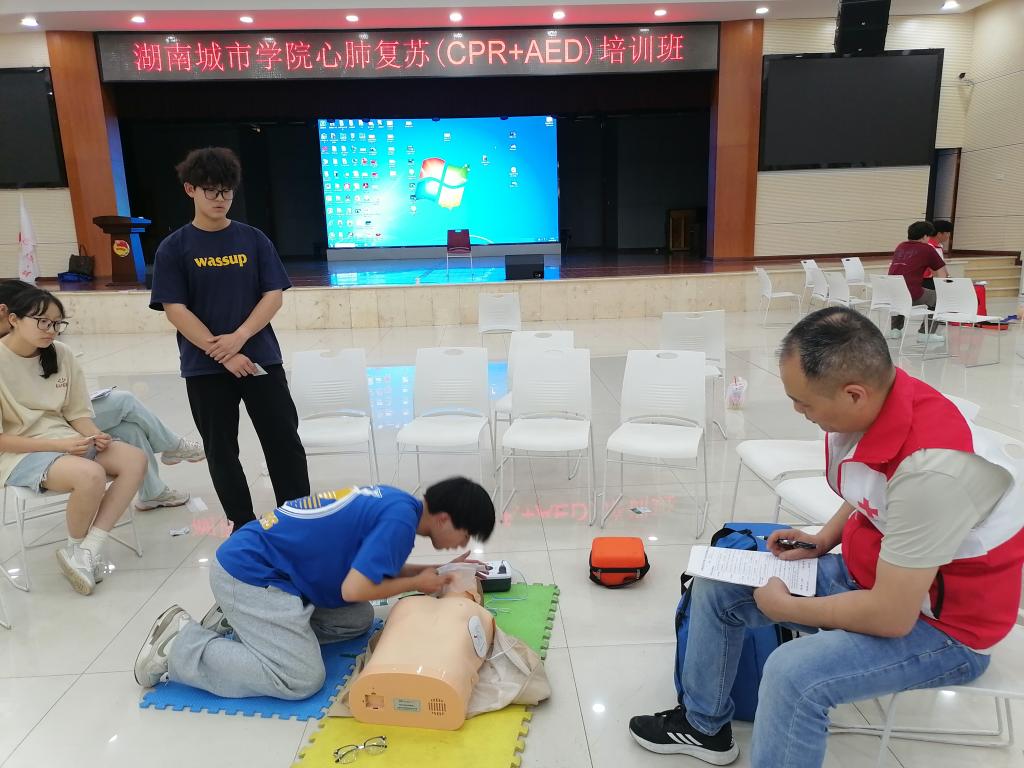 本次培训采取“理论学习+实操训练”的方式。在理论学习环节,益阳市红十字会应急救护培训老师详细讲解了心肺复苏(包括胸外心脏按压、人工呼吸、自动体外除颤)的操作步骤和注意事项,演示了胸外心脏按压、人工呼吸和自动体外除颤器使用的完整操作流程。在培训老师的精心指导下,130名大学生分10组开展了心肺复苏各项实操训练。