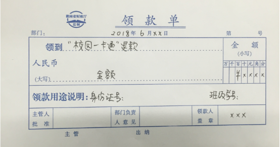 如“校园一卡通”内有余额需退款的同学,请在学生二食堂大厅内按要求填写好《领款单》后,至学生二食堂东面“餐卡充值处”排队办理退款手续,请各位毕业生相互转告。