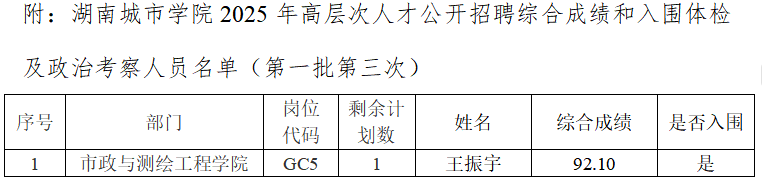 根据《Beat365中文官方网站2025年高层次人才公开招聘公告》要求,经公开报名、资格审查、直接考核等环节,现将综合成绩和入围体检及政治考察人员名单(第一批第三次)予以公告(详见附表)。