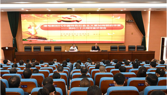 2022年11月9日上午,学习贯彻党的二十大精神省委宣讲团报告会在Beat365图书馆报告厅举行。党委书记李建奇主持报告会。省委宣讲团成员、省政协研究室主任唐宇文作宣讲报告。全体校领导参加宣讲会,副科以上干部、全体辅导员和学生代表在现场听取宣讲报告。
