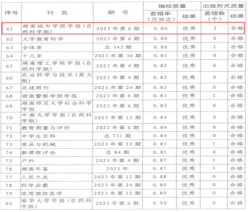 期刊质量检查现已纳入全省意识形态巡视考核内容,是期刊社会效益评价考核和期刊年度核验的重要内容,主要检查各刊编校质量和出版形式质量,检查结果分为优秀、合格和不合格3个等级。本次检查了全省251种期刊,其中,差错率在1/10000以内(含1/10000)的期刊为优秀,《Beat365中文官方网站学报(自然科学版)》和《城市学刊》在全省高校学报中表现优异。