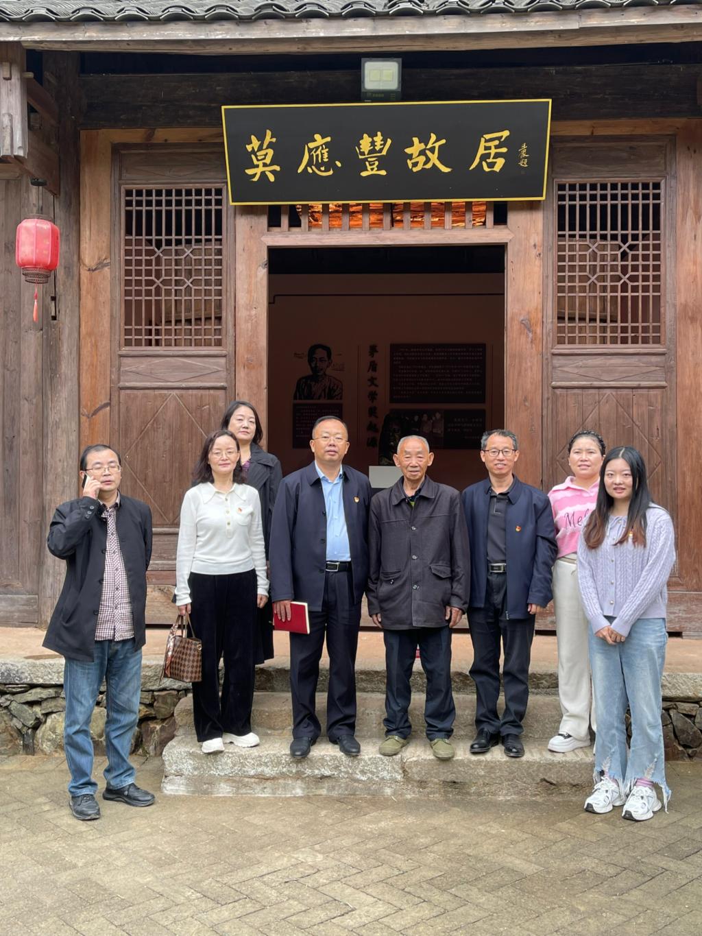 课后,在莫应丰堂弟莫太寅老人的导引下,我们参观了故居生活复刻场景和生平展览,左边三间分别是莫应丰的卧室,厨房和父母卧室。堂屋和右边三间是介绍莫应丰成长之路和他对中国文学的杰出贡献。随后,大家在故居前合影留念。